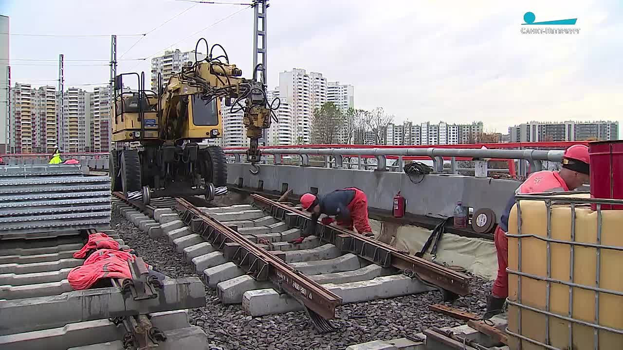После термитной сварки плоскость рельсов выводят в идеал. Сейчас на уникальном путепроводе возвышающемся над кольцевой автодорогой финальный этап работ. Установлены все опоры контактной сети, начинается её монтаж. Рабочие укладывают путь. Длина переправы — больше километра. Это старт трамвайной линии «Купчино-Шушары-Славянка». Объект во много уникален.