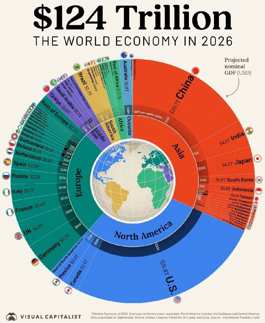 Даже визуально видно, что мировой экономический центр сместился в Азию, и это по номинальному суммарному ВВП. То есть добавленной стоимости в Азии уже создаётся больше, чем в Северной Америке или Европе, и это с поправкой на всё большую виртуализацию экономик развитого мира.