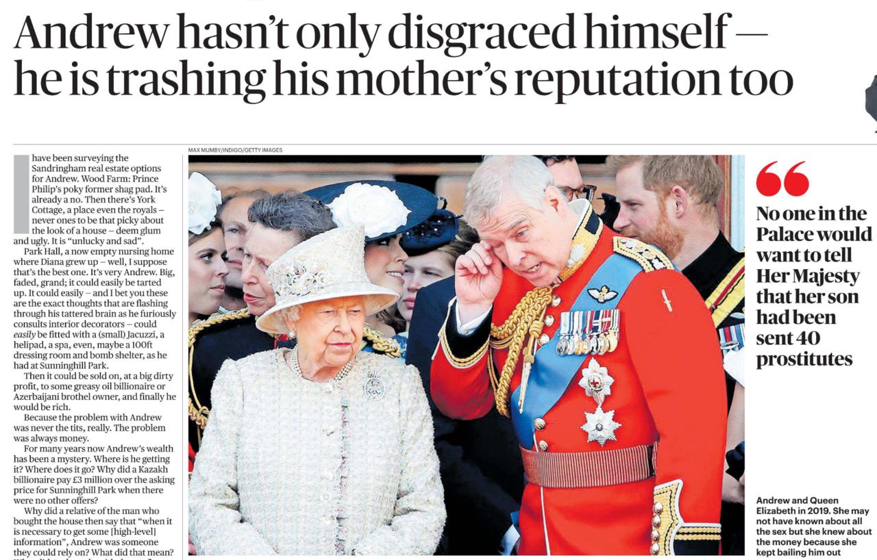 Как вы понимаете, британская пресса вовсю мусолит избитую тему лишения принца Эндрю титулов и жилья. The Sunday Times сегодня, к примеру, переживает, что вся эта история уничтожает и репутацию его умершей мамани - королевы Елизаветы.