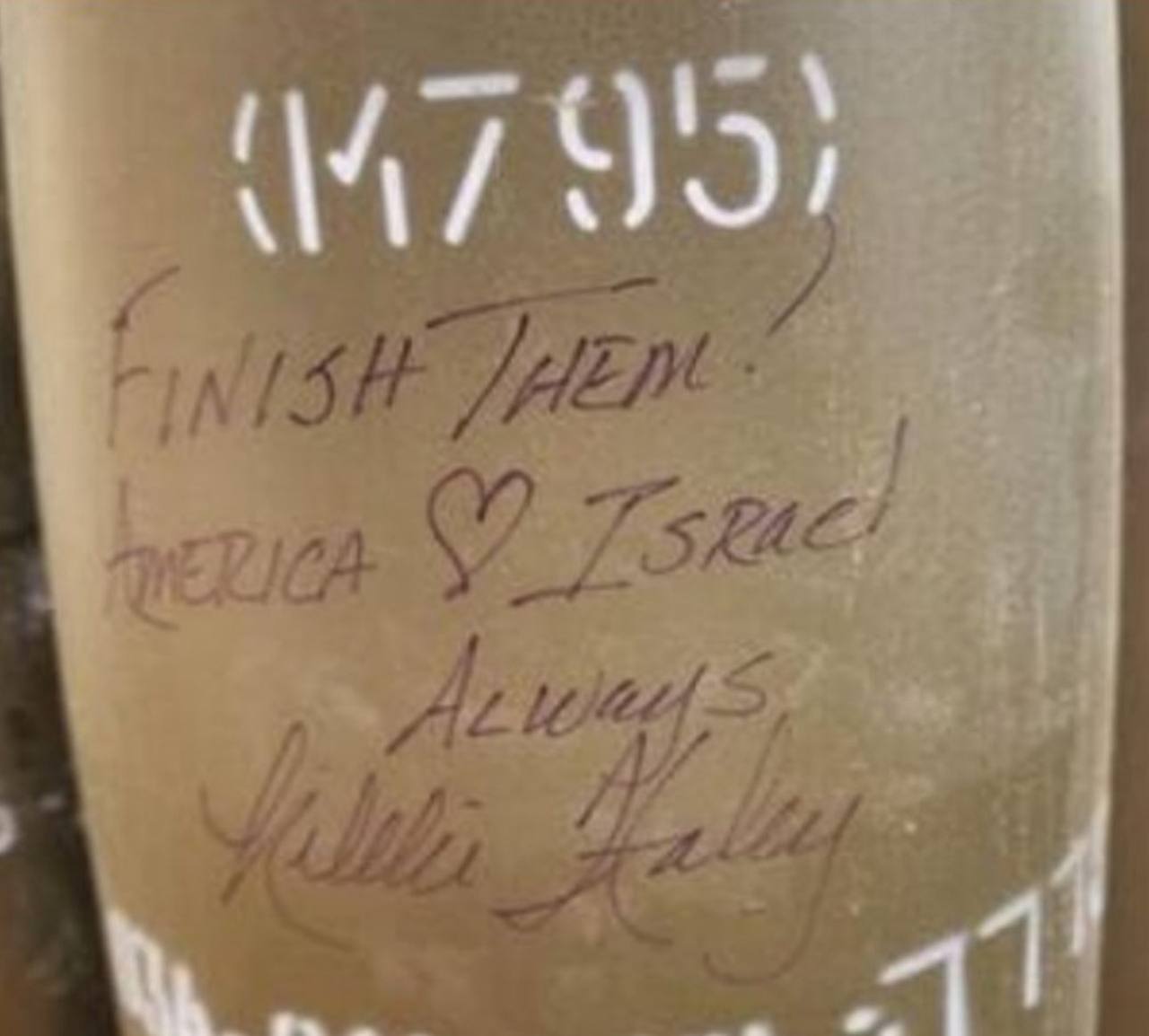 Это же демоническое существо в прошлом году оставляло автографы на израильских снарядах. «Прикончите их», - писала Хейли на снарядах, которыми убивали стариков, детей и женщин.