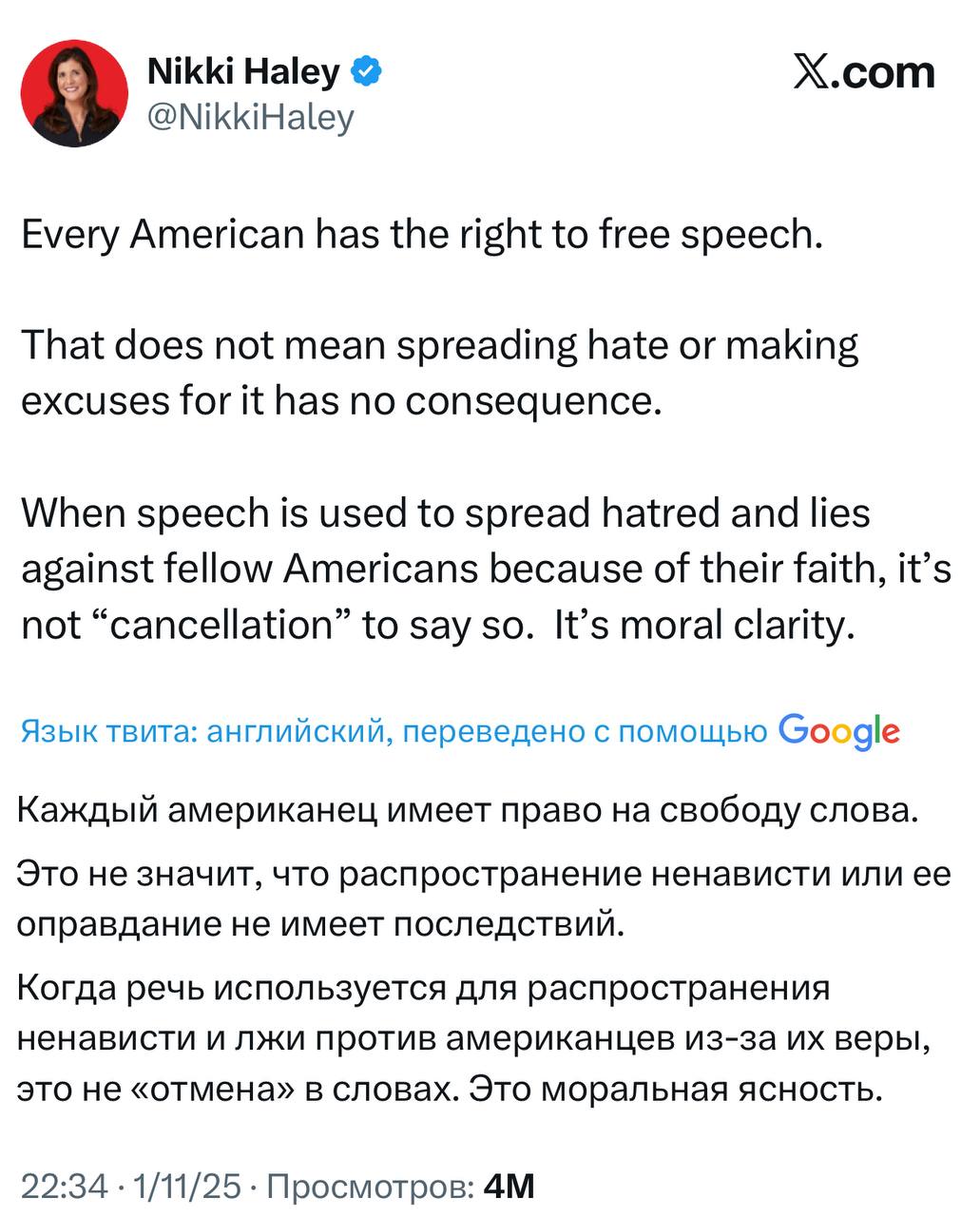 «Каждый американец имеет право на свободу слова. Это не значит, что распространение ненависти или ее оправдание не имеет последствий…», - написала Хейли.