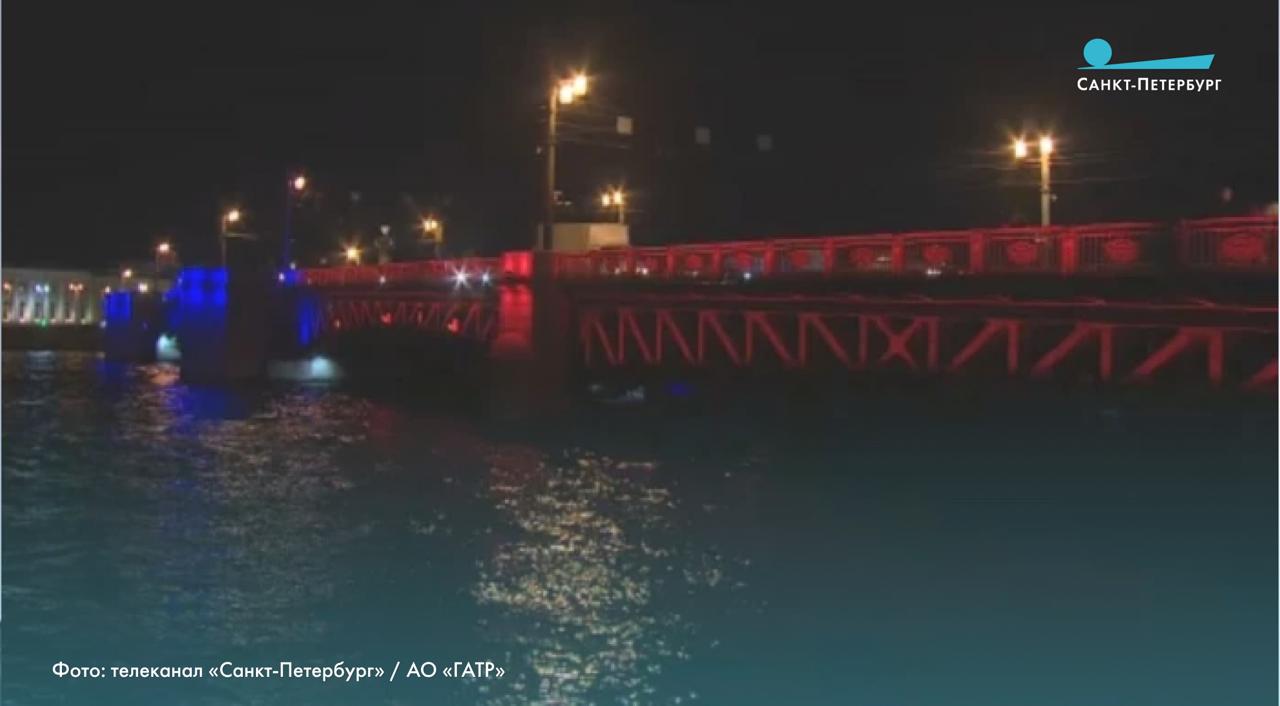 Вечером 4 ноября подсветка Дворцового моста засияла цветами российского флага. Такой режим подсветки включили по случаю Дня народного единства.