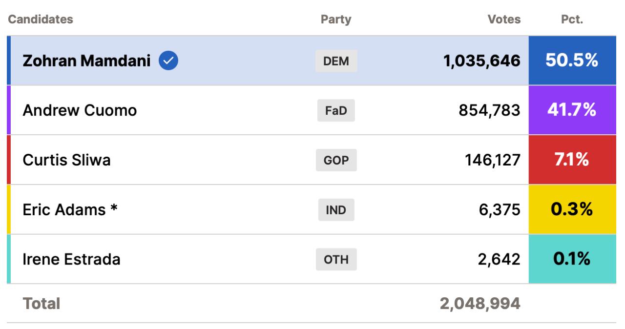 Экс-губернатор Нью-Йорка решил повторно опозориться и пошёл против Мамдани как независимый кандидат. Он наснимал огромное количество роликов при помощи ИИ, которые, правда, никак не выстрелили. А вот Мамдани удалось объединить вокруг себя армию волонтёров, собирать целые стадионы сторонников и в конечном счёте получить больше 50% голосов.