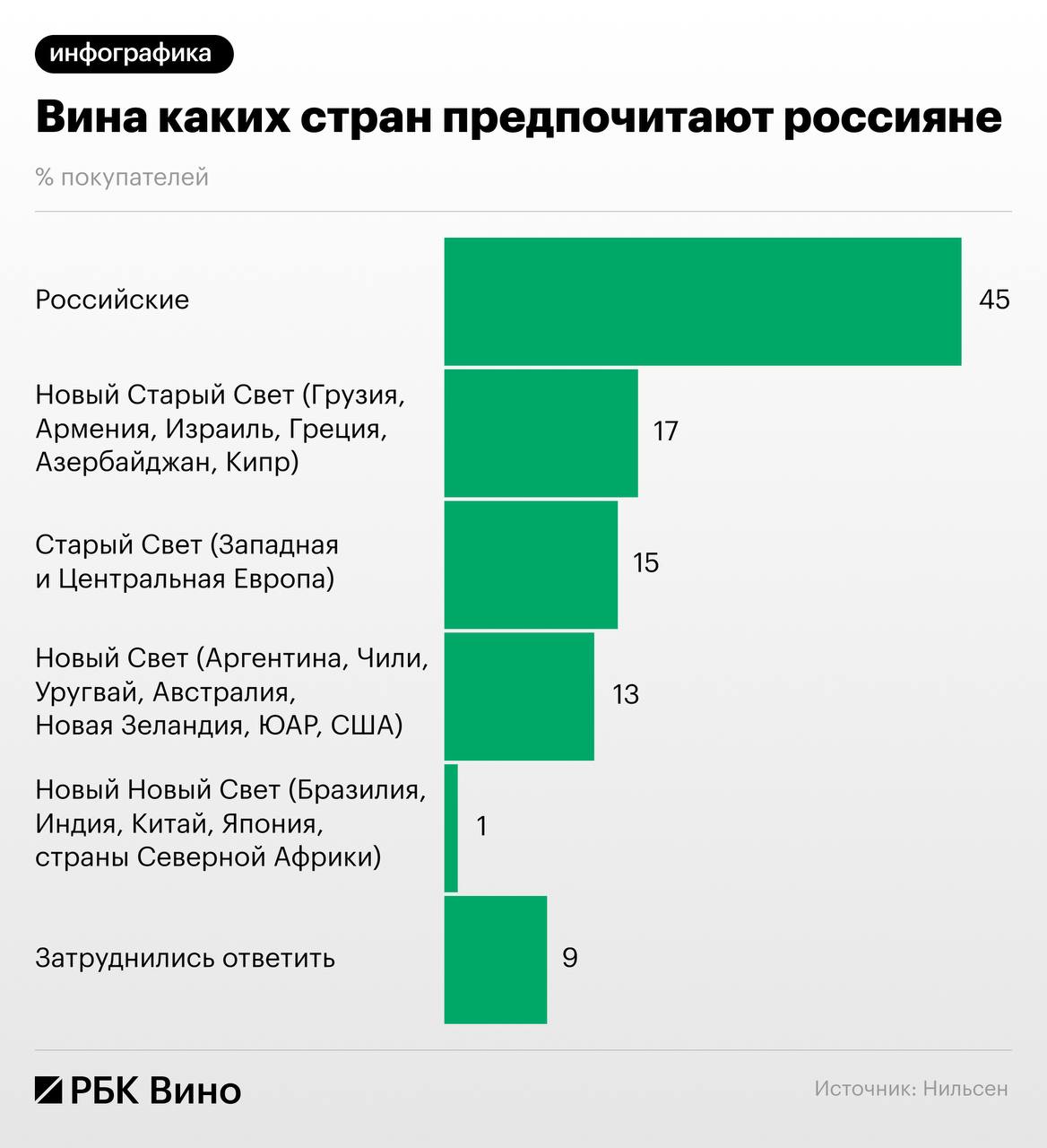 Самое популярное — российское красное полусладкое. За ним следуют вина «Древнего Света» (17%) и Старого Света (15%).