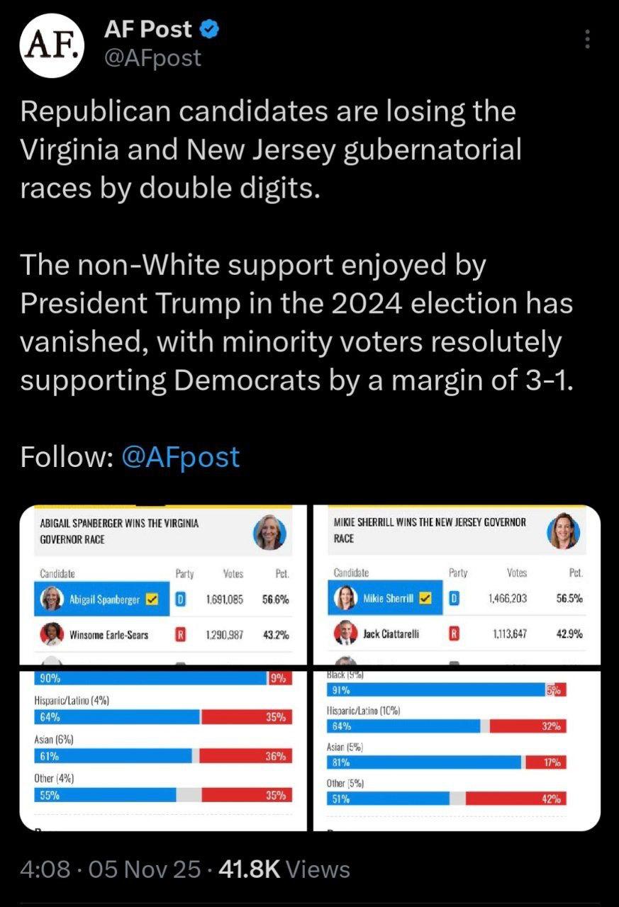Местные выборы в политическое межсезонье - всегда барометр настроений электората. Де-факто они являются референдумом о Трампе. Этот референдум республиканцы с грохотом провалили. Уровень поддержки кандидатов от республиканцев среди электората меньшинств - чернокожих, латиноамериканцев, азиатов - рухнул на уровень пятилетней давности.