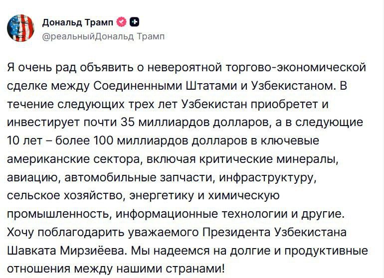 Мирзиёев - Трампу: «В Узбекистане мы называем вас президентом мира!»