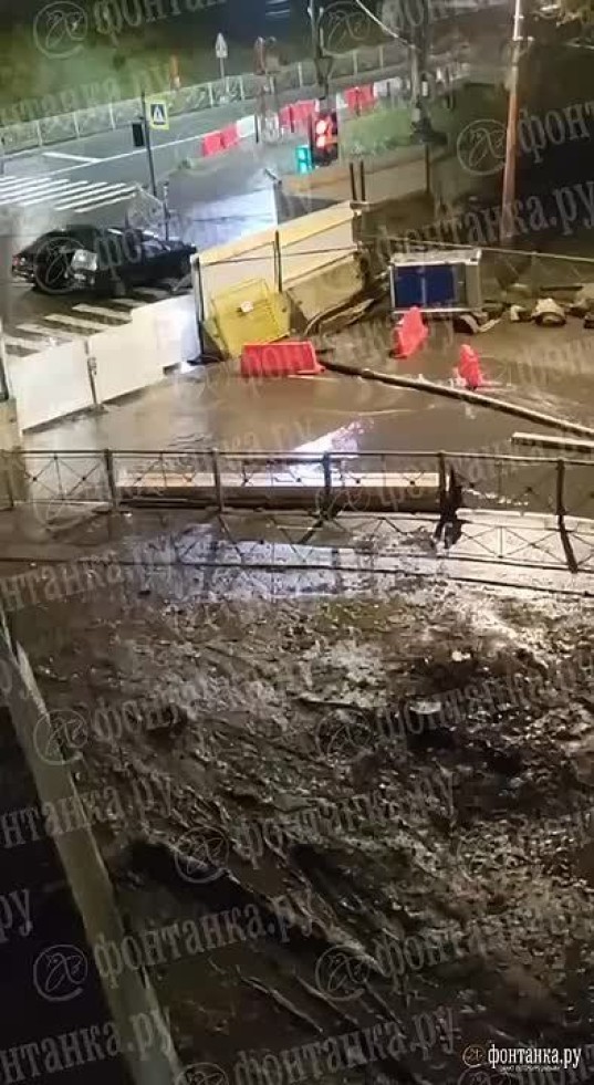 На углу Харченко и 1-го Муринского дорога ночью превратилась в ручей. В пресс-службе «Водоканала Петербурга» пояснили, что подтопление произошло из-за затяжного дождя и не связано с коллектором и октябрьским происшествием.