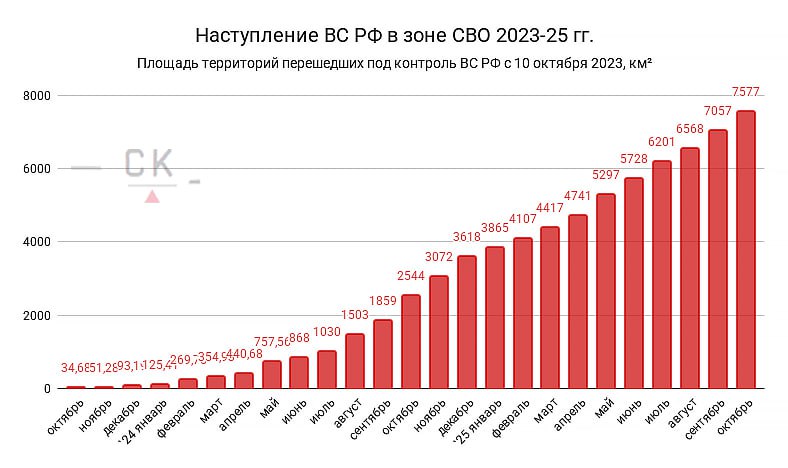 За 25 месяцев наступления под контроль ВС РФ в зоне проведения СВО перешло 7 577 км (+ 520 км от 10 октября 2025) территорий с суточным темпом продвижения 9,94 км (+0,29 км от 10 октября) в среднем за всё время наступления.