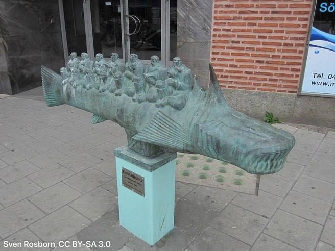 Скульптура 1940 года изображает семь человек на спине рыбы и символизирует массовую эмиграцию шведов в Америку с XIX до начала XX века.