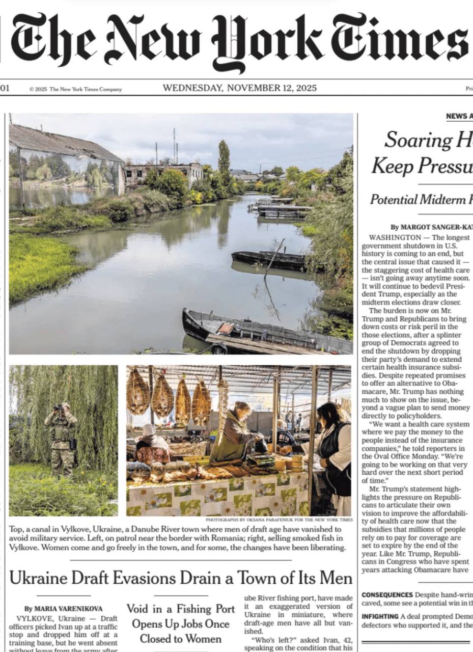 Сегодня на первой полосе The New York Times - большой репортаж из Вилково Одесской области, «украинской Венеции» и «города женщин», как его назвала газета. Потому что мэр города заявил американцам: «Я единственный мужчина, который остался».