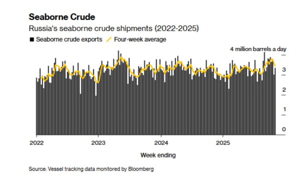 «Поставки российской нефти морским путём сокращаются уже третью неделю подряд, достигнув двухмесячного минимума. Снижение объёмов усугубляет падение цен, что негативно сказывается на военных фондах Кремля. Согласно данным отслеживания судов, за четыре недели до 9 ноября страна экспортировала 3,45 млн баррелей в день, что примерно на 130 000 меньше, чем за тот же период до 2 ноября. В прошлом месяце США ввели санкции против двух крупнейших российских производителей нефти, что побудило некоторых покупателей в Азии заявить о сокращении закупок».