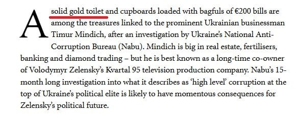 Статья обозревателя The Spectator Оуэна Мэтьюза о том, что скандал с Миндичем может привести к отставке Зеленского начинается со слов ‘Золотой унитаз...’