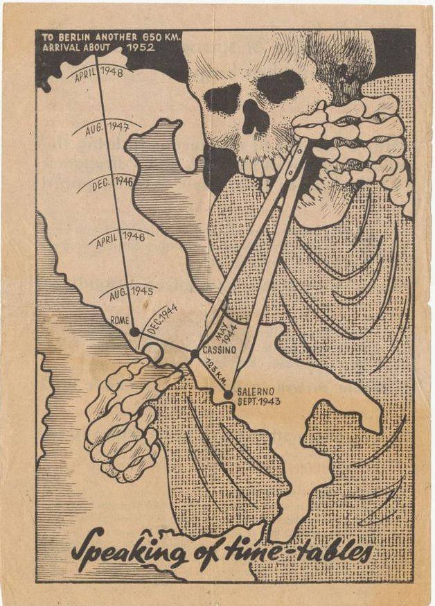 Чем, почти полностью повторяет смысловой посыл вот этой немецкой листовки «Кстати, о расписании», которую разбрасывали в Италии над позициями союзников: 125 км от Салерно до Кассино союзники шли 8 месяцев, из чего делается вывод, что такими темпами до Берлина дойдут к 1952 году.