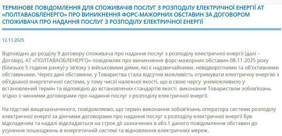 Полтавская область отвалилась от единой энергосистемы Украины вследствие ударов ВС РФ и аварий.