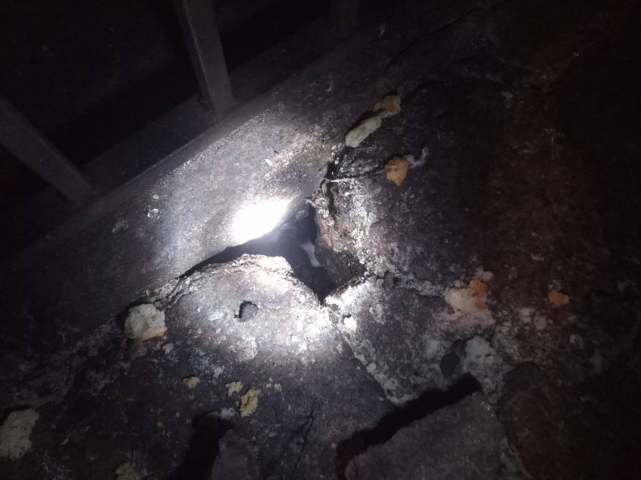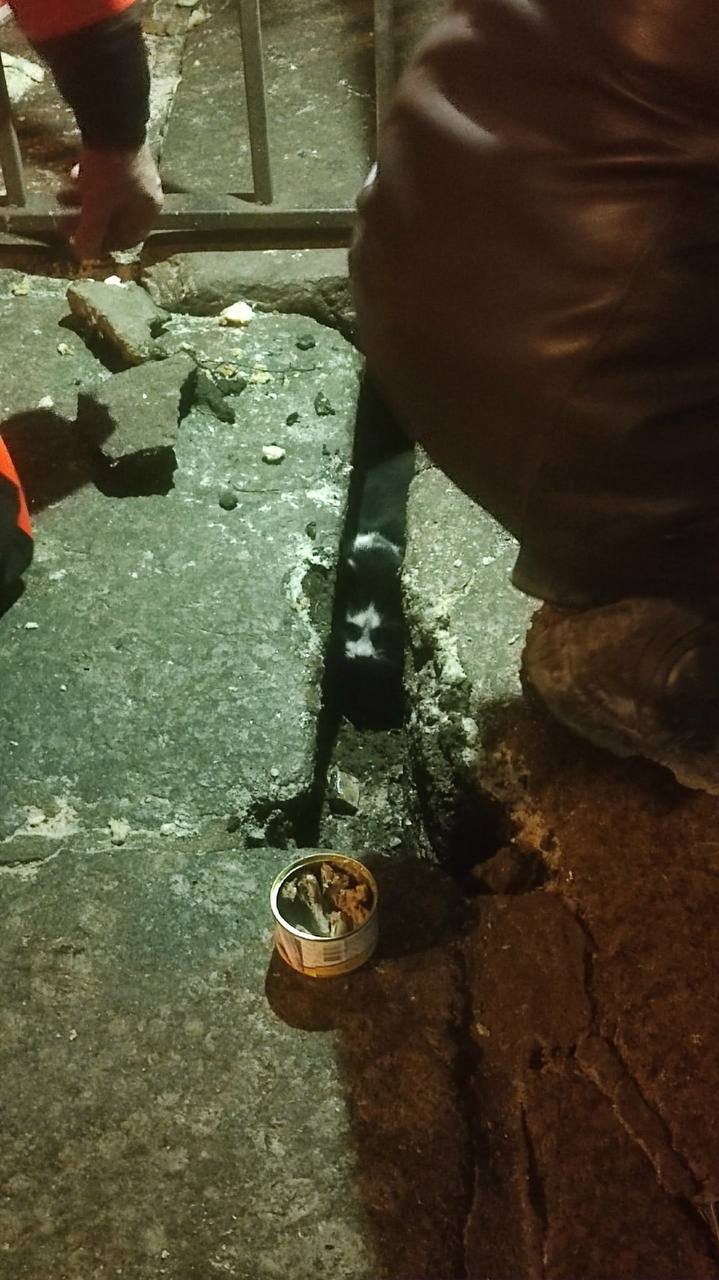Во время вечерней спасательной операции выяснилось, что у кота есть выход на поверхность — через межплиточную щель. Её, щель, ещё немного расширили и поставили миску с едой.