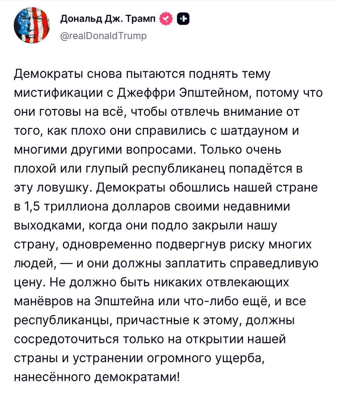Демократы снова поднимают тему с Эпштейном, потому что готовы на всё, чтобы отвлечь внимание от шатдауна, — заявил Трамп