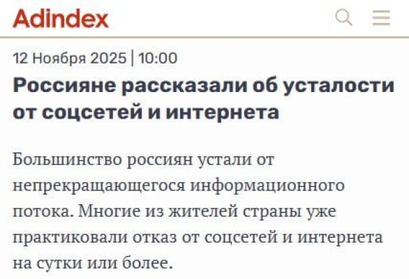 Оказывается, россияне устали от соцсетей и интернета. Каждый второй хотя бы раз устраивал себе детокс от новостей и соцсетей и отмечал лёгкость и спокойствие, а каждый четвёртый хотел бы потратить свободное от интернета время на книги. Очень согласен насчет книг, но все-таки хотелось бы детокс и книги по собственной воле устраивать, а не в обязательном порядке, о чем в последнее время ходят настойчивые слухи