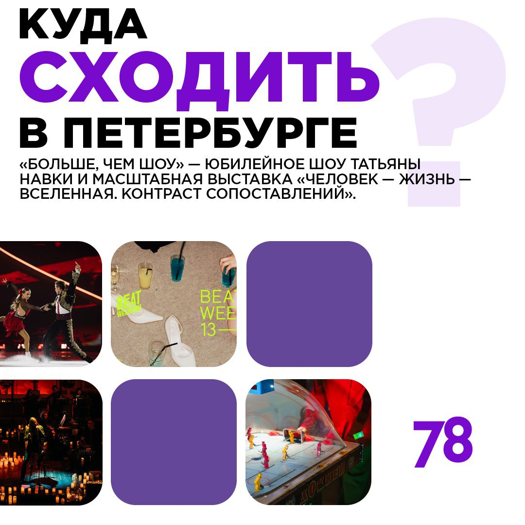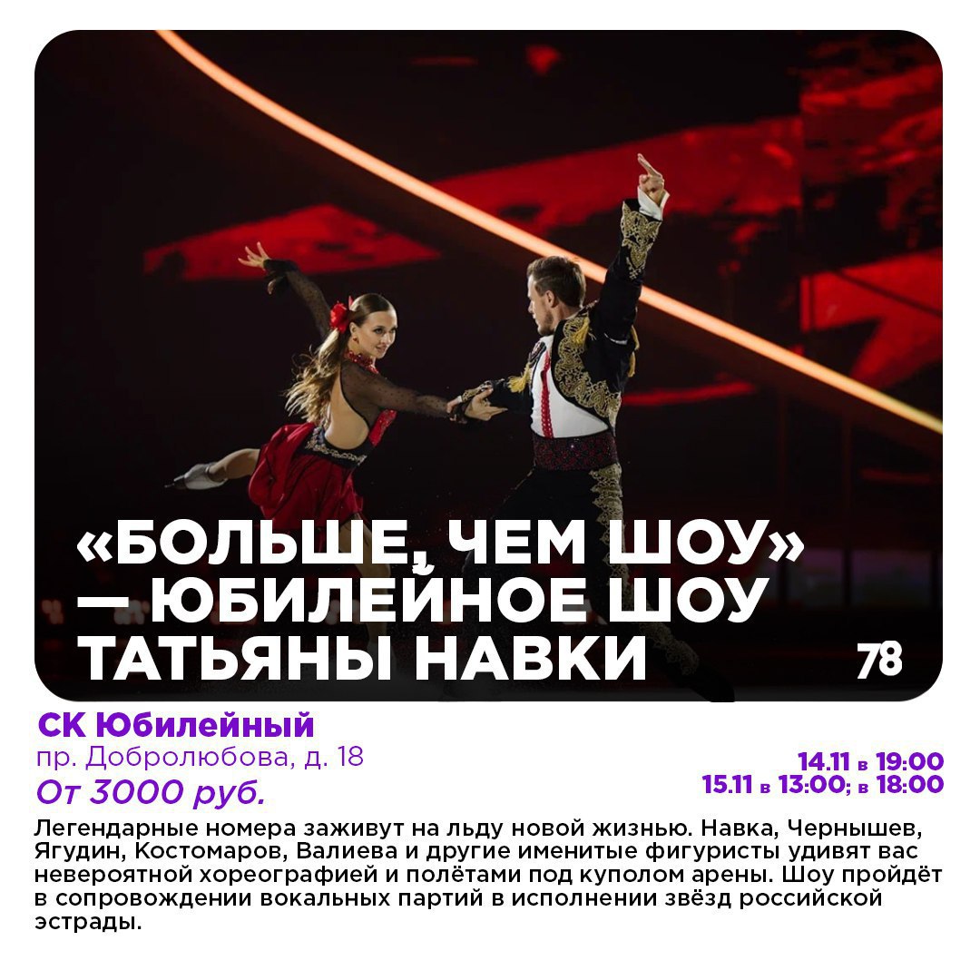 Нева пока не замёрзла, а вот в СК «Юбилейный» лёд что надо. В честь 50-летнего юбилея Татьяна Навка подготовила для гостей настоящую феерию: от вокальных партий в исполнении звёзд российской эстрады до 3D-инсталляций и полётов под куполом арены.
