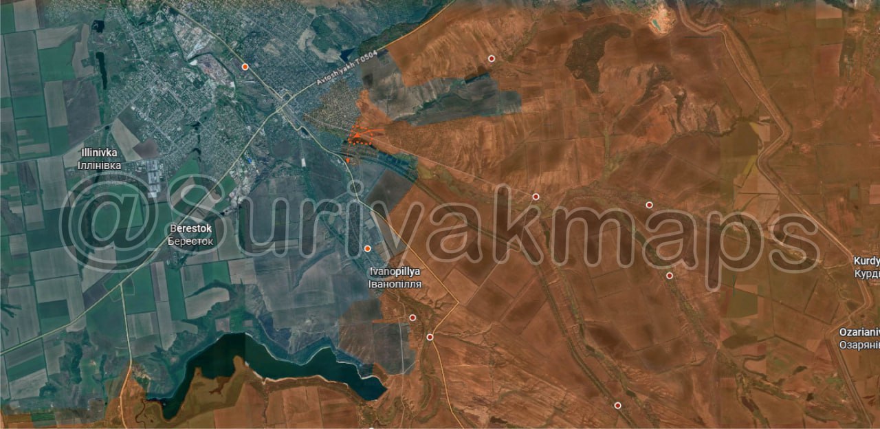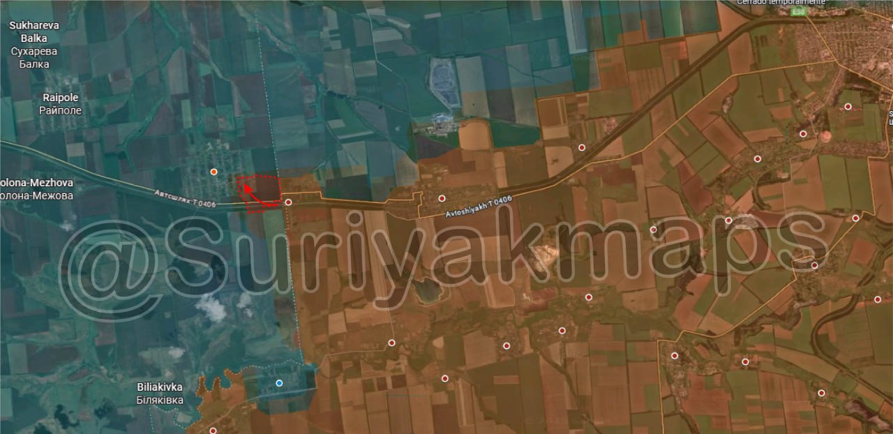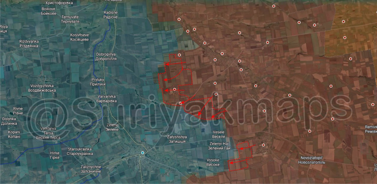 На Гуляйпольском направлении: Российские подразделения продолжили продвижение к реке Гайчур, взяв под контроль ряд позиций западнее и южнее Сладкого и Новоуспеновского, включая Ровнополье и Яблоково. Также за последние две недели достигнуто продвижение западнее Малиновки с занятием системы траншей в этом районе.