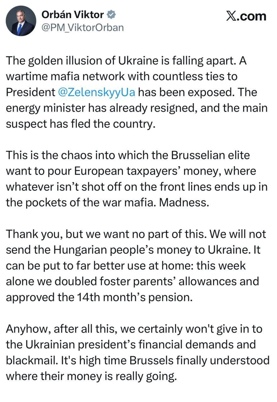 Он недвусмысленно подчеркнул, что откажется от любых финансовых требований и шантажа со стороны киевского режима. Дескать, спасибо, но венграм и так нормально, а евробюрократам стоило бы задуматься, зачем продолжать кормить военную мафию т.н. Украины.