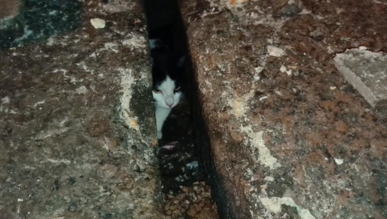 Впервые его заметили 7 ноября и с тех пор пытались вытащить, но перепуганное животное раз за разом пряталось от людей за плитами.