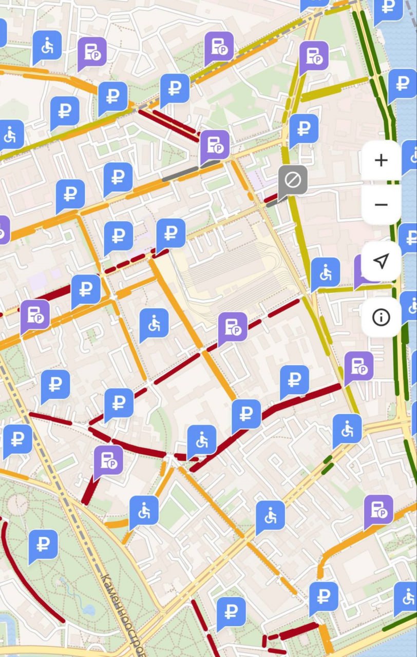 В приложении парковок покрасили улицы. Это подсказка для водителей, где дешевле оставлять машину