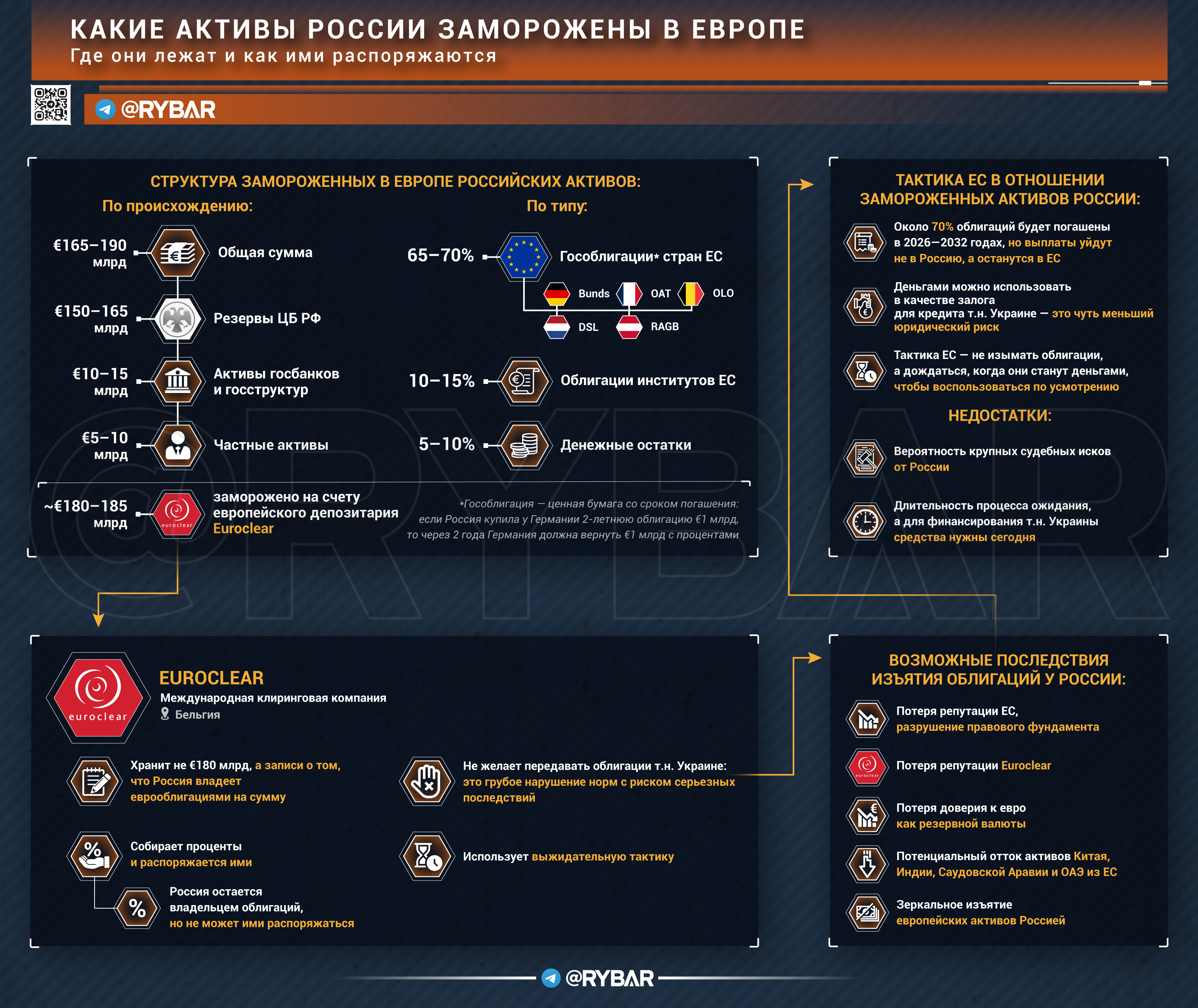 Подробнее об активах и месте их заморозки:Euroclear — не банк с хранилищем наличных денег, а международный депозитарий, который хранит ценные бумаги, проводит расчеты между покупателями и продавцами и следит за законностью процесса.