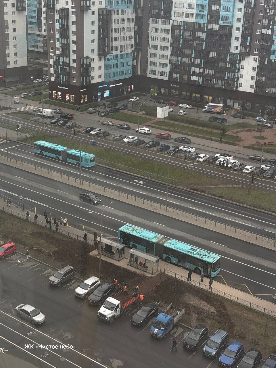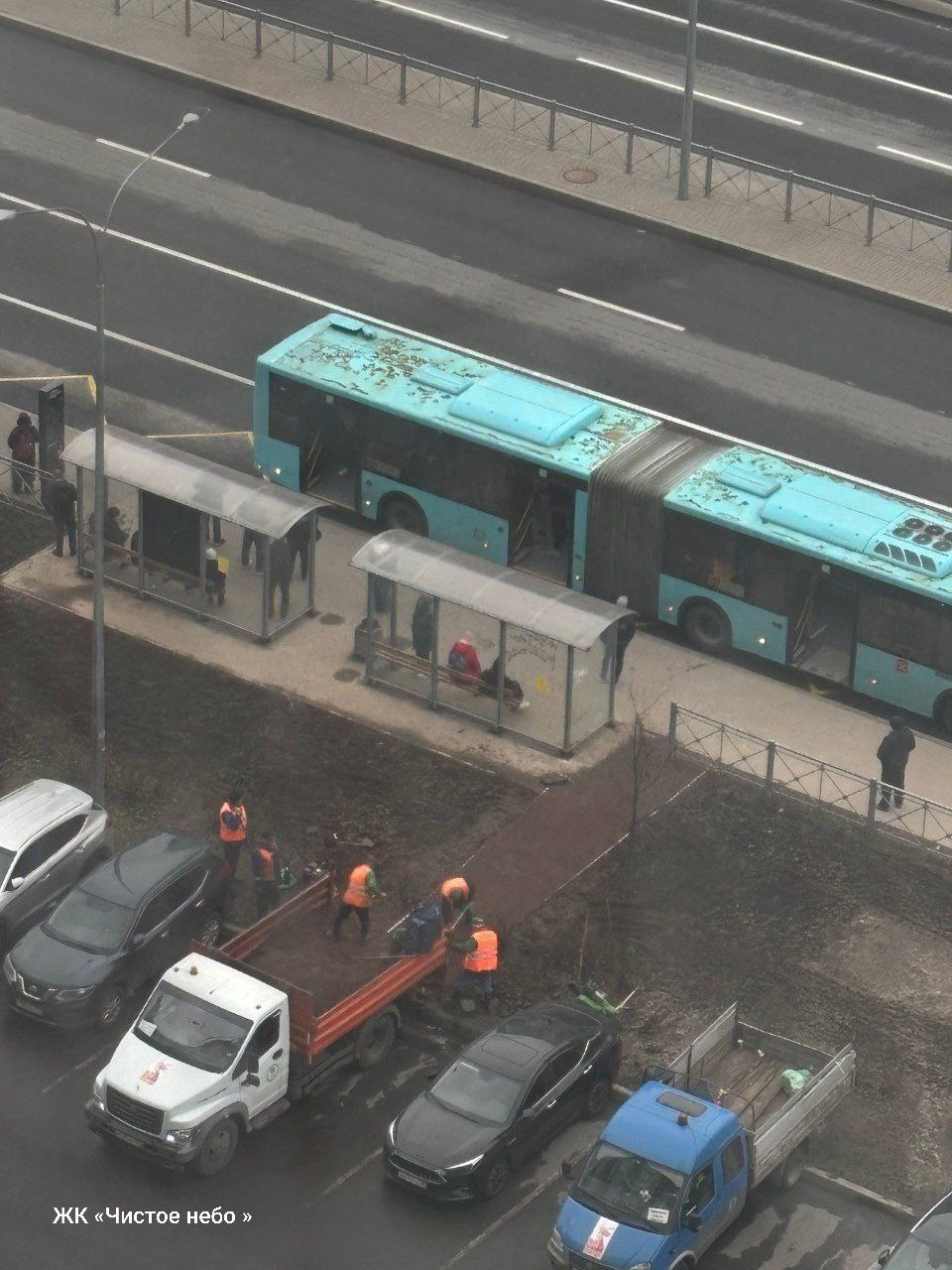 Посреди грязи на Комендантском проспекте гладут дорожку к остановке – о проблеме мы писали здесь.