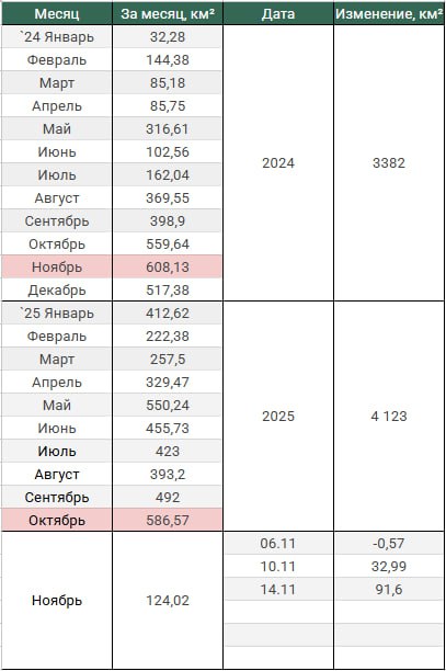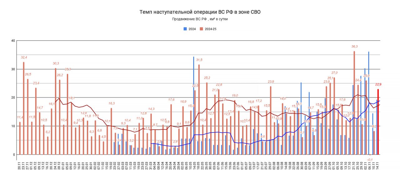 Обновление по данным c 10 по 13 ноября 2025. Темп продвижения +22.9 км в сутки за период, общее продвижение 91.6 км.