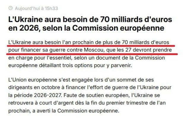 ‘По данным Европейской комиссии, в следующем году Украине потребуется 70 миллиардов евро в 2026 году для финансирования войны против Москвы’.