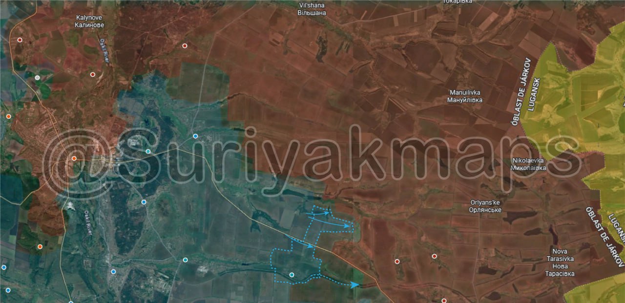 Обстановка на северо-восточном фронте: На Дворичанском направлении за последние три дня российская армия установила полный контроль над населённым пунктом Дворичанское. Тем временем, восточнее города Купянска украинская армия продолжает оказывать сопротивление российскому наступлению и даже возвращает себе позиции к северо-западу от Степовой Новосёловки. Кроме того, украинские атаки к западу от этой местности позволяют предположить, что населённый пункт Песчаное находится под полным контролем Украины.