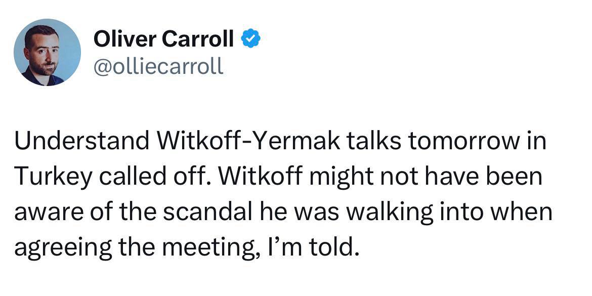 Запланированные в Турции переговоры между Стивом Уиткоффом и Андреем Ермаком отменены, — журналист The Economist Оливер Кэролл.