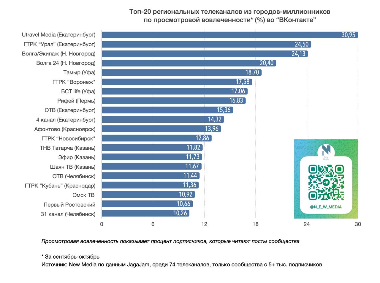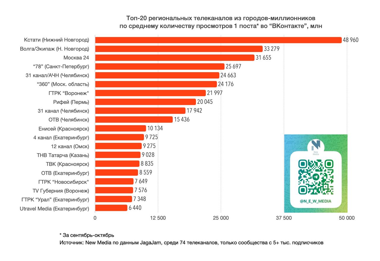 Топ-20 региональных телеканалов "ВКонтакте" в октябре 2025 года