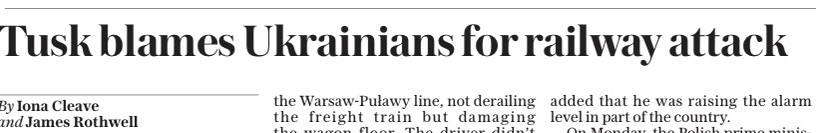 Впечатляет заголовок в сегодняшней The Daily Telegraph: «Туск обвиняет украинцев в атаке на железной дороге». Нет, в самой статье, конечно, говорится о том, что эти украинцы якобы «работают на Россию». Но заголовок однозначно заставляет задумываться над тем, что имеет в виду редакция.