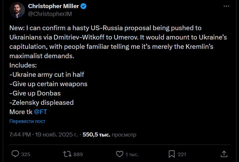 Другой журналист — Кристофер Миллер пишет, что «американо-российское предложение» продвигается украинцам через Умерова: