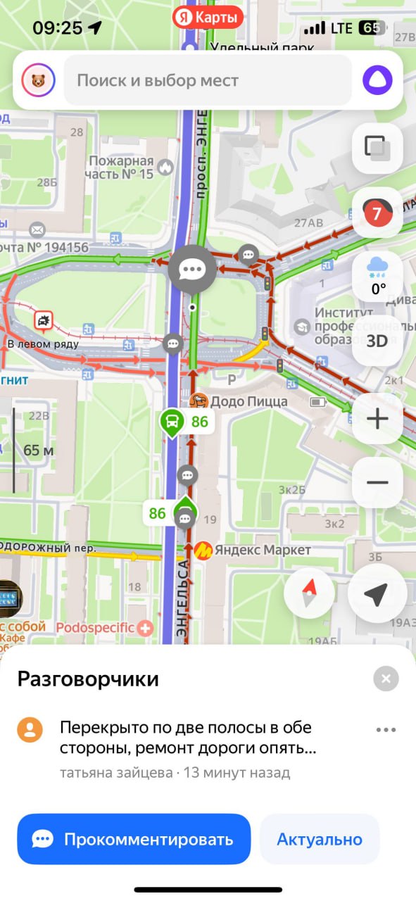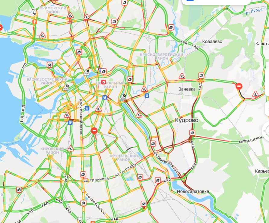 Вместе с этим участком КАД плотно стоит и Народная улица, а также Октябрьская набережная и участки Дальневосточного и Большевиков. Также в бордовый окрасилась и Светлановская площадь.