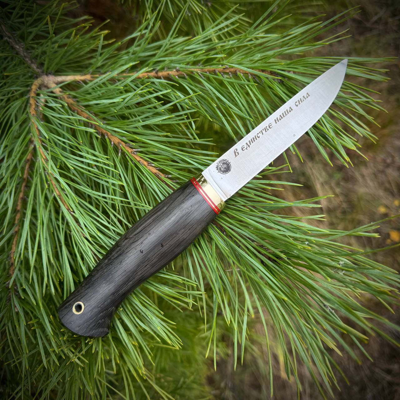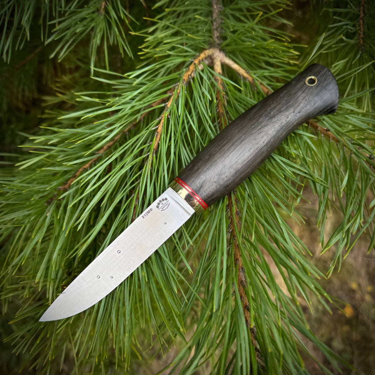 Нож изготовлен из отечественных материалов: сталь Х12МФ, вековой мореный дуб, ножны из натуральной кожи.