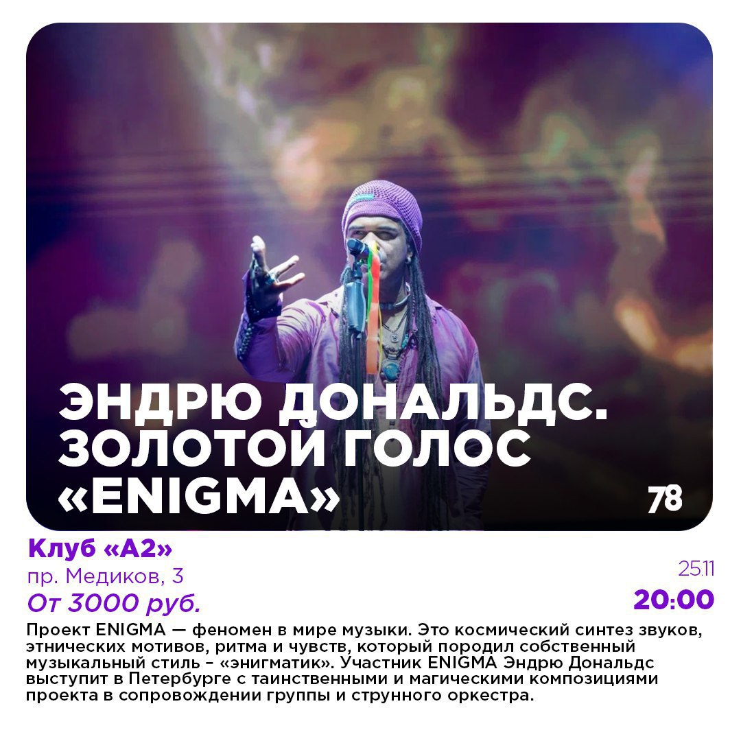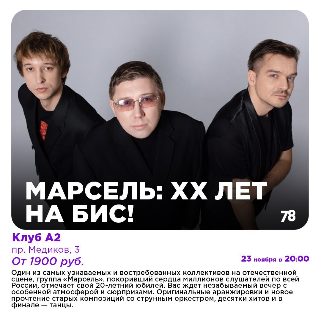 После активного отдыха советуем отдохнуть культурно: в Концертном зале Мариинского театра как раз представят новую постановку оперы «Золотой петушок» с богатой оркестровкой, в клубе «А2» вы сможете услышать композиции магического проекта ENIGMA и сольные хиты Эндрю Дональдса, а группа «Марсель» отметит своё 20-летие зажигательным концертом.