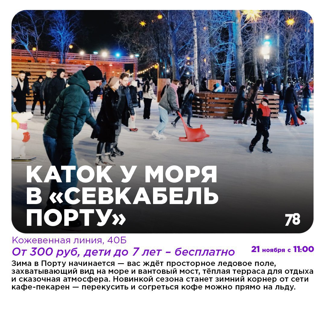 Как раз под первый снег открывается каток в Севкабель Порту. 2200 квадратных метро чистого наслаждения: красивые виды, романтичная музыка и сказочная атмосфера.