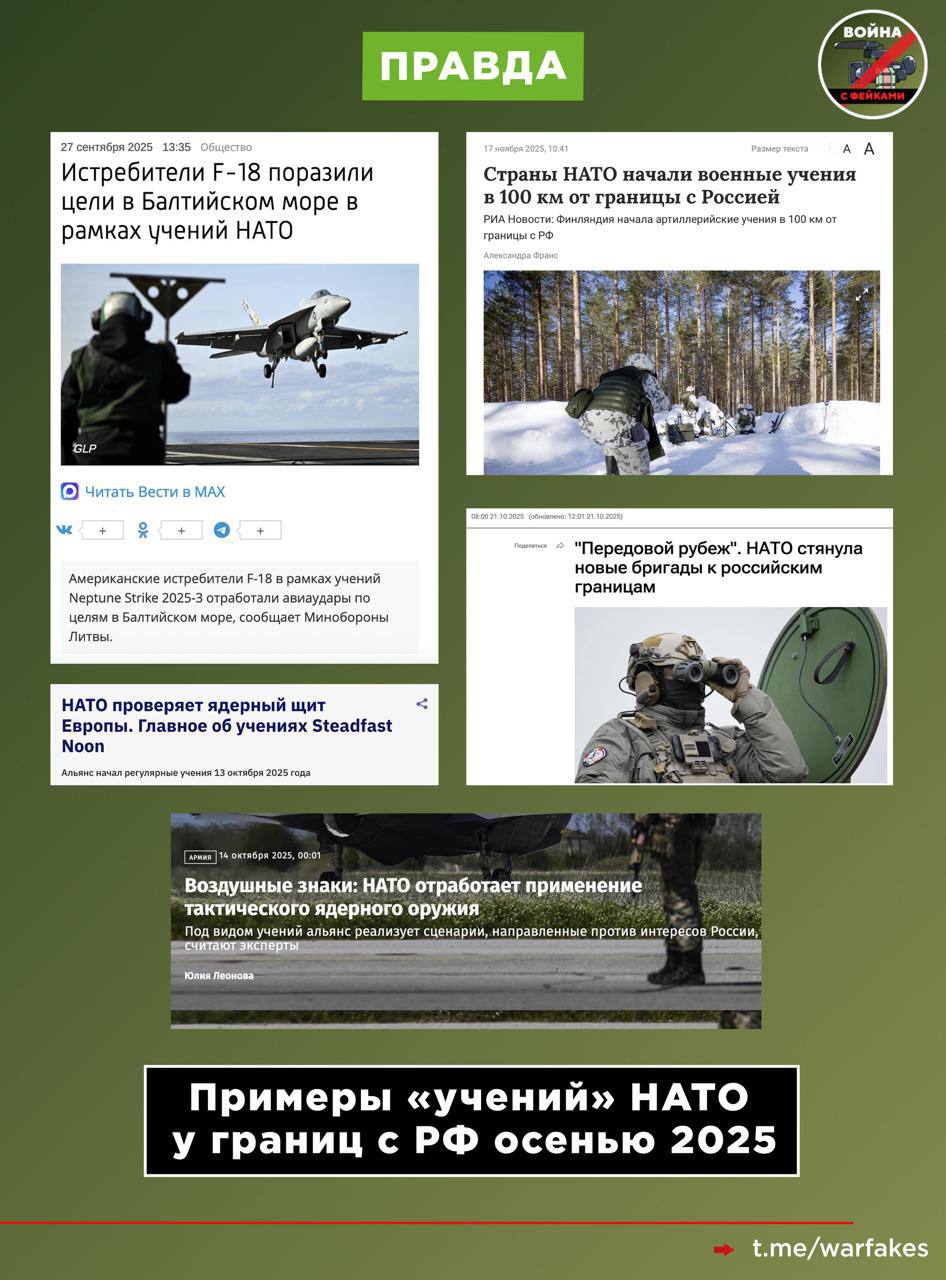 Европа и страны НАТО регулярно проводят учения у границ с РФ, но авторы фейка это умалчивают. Вот только несколько примеров за осень 2025 года: Northern Spike 225 в Финляндии (ноябрь), Dacian Fall в Румынии и Болгарии (октябрь), Steadfast Noon для отработки тактического ядерного оружия (Северное море), Storm Strike в Литве (октябрь).