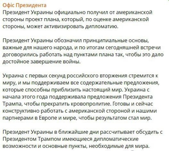 ‘Президент Украины официально получил от американской стороны проект плана, который, по оценке американской стороны, может активизировать дипломатию. По итогам сегодняшней встречи договорились работать над пунктами плана так, чтобы это дало достойное завершение войны. Готовы и сейчас конструктивно работать с американской стороной и нашими партнерами в Европе и мире, чтобы результатом стал мир. Президент Украины в ближайшие дни рассчитывает обсудить с Президентом Трампом имеющиеся дипломатические возможности и основные пункты, необходимые для мира’.
