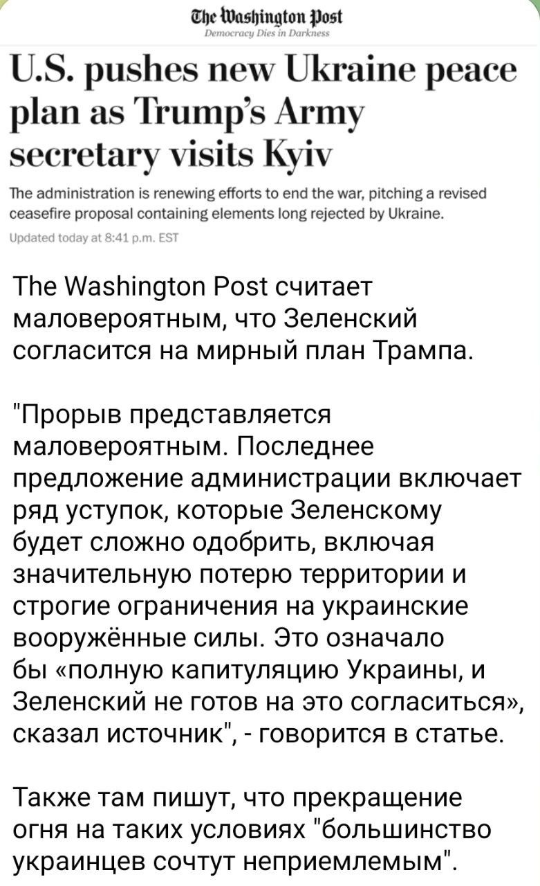 Что же до Зеленского, ему конечно очень хочется просто заморозки по ЛБС, но в плане Трампа есть то, на что Зеля врядли пойдет - на добровольный вывод с оставшихся городов ДНР. Учитывая ситуацию по сути готового мятежа, отвод войск без боя, будет восприниматься как измена, тем более на фоне скандала с коррупцией. Отсюда и надежда на появление какого то лучшего варианта.