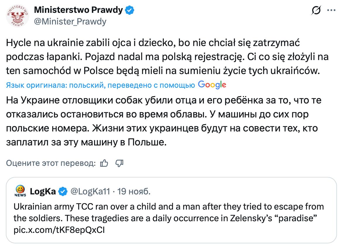 В Польше обратили внимание на то, что машина украинских людоловов из ТЦК, сбившая насмерть отца и его ребенка, ездила на польских номерах. И резонно отмечают: «Жизни этих украинцев будут на совести тех, кто заплатил за эту машину в Польше».
