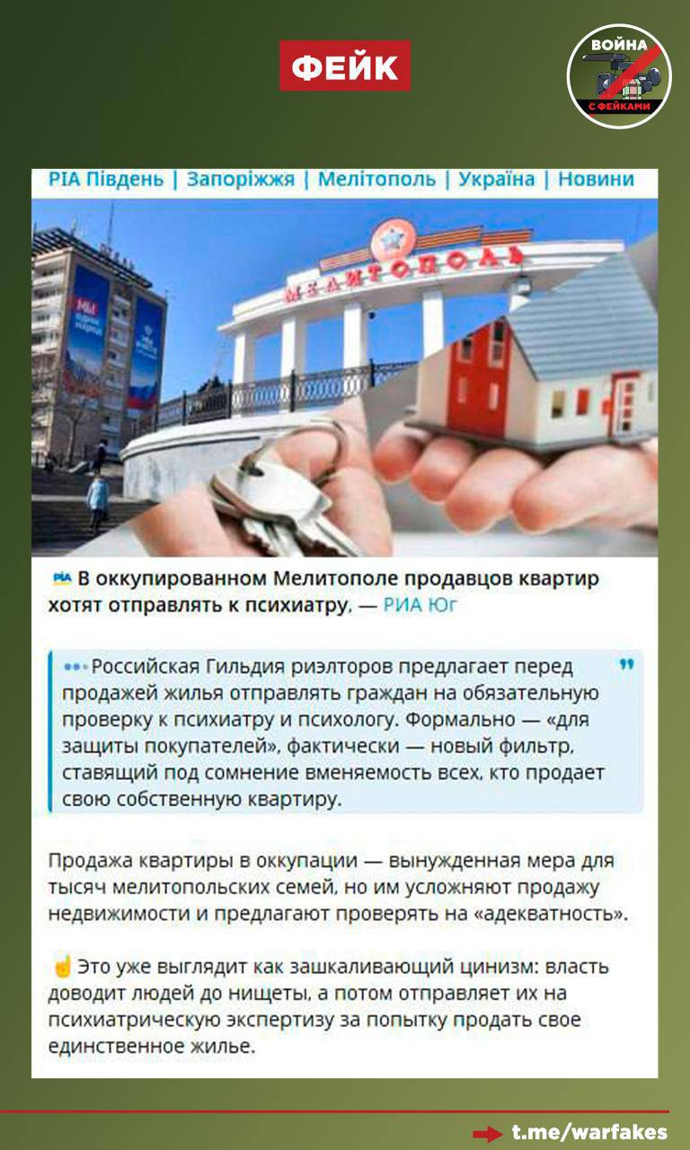 Фейк: Власти РФ настолько циничны, что мешают жителям Мелитополя уезжать из города. Для этого они намерены отправлять к психиатру каждого, кто решит продать там квартиру, заявляют украинские телеграм-каналы.