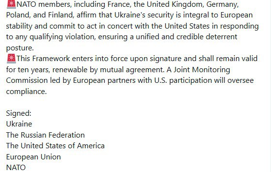 Настоящее Рамочное соглашение устанавливает условия перемирия между Украиной и Российской Федерацией и предоставляет гарантии безопасности, основанные на принципах статьи 5 Североатлантического договора, адаптированные к обстоятельствам этого конфликта и интересам Соединенных Штатов и их европейских партнеров.