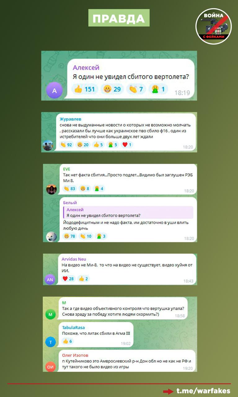 Правда: Ни один Ми-8 и даже Ми-28 (а на видео именно он) над территорией Ростовской области или в других регионах не подвергался атаке, а тем более не был сбит.