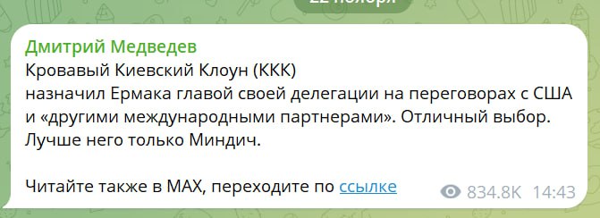 Именно так прокомментировал Дмитрий Медведев новость о назначении главы офиса Зеленского Ермака, руководителем делегации по мирным переговорам.