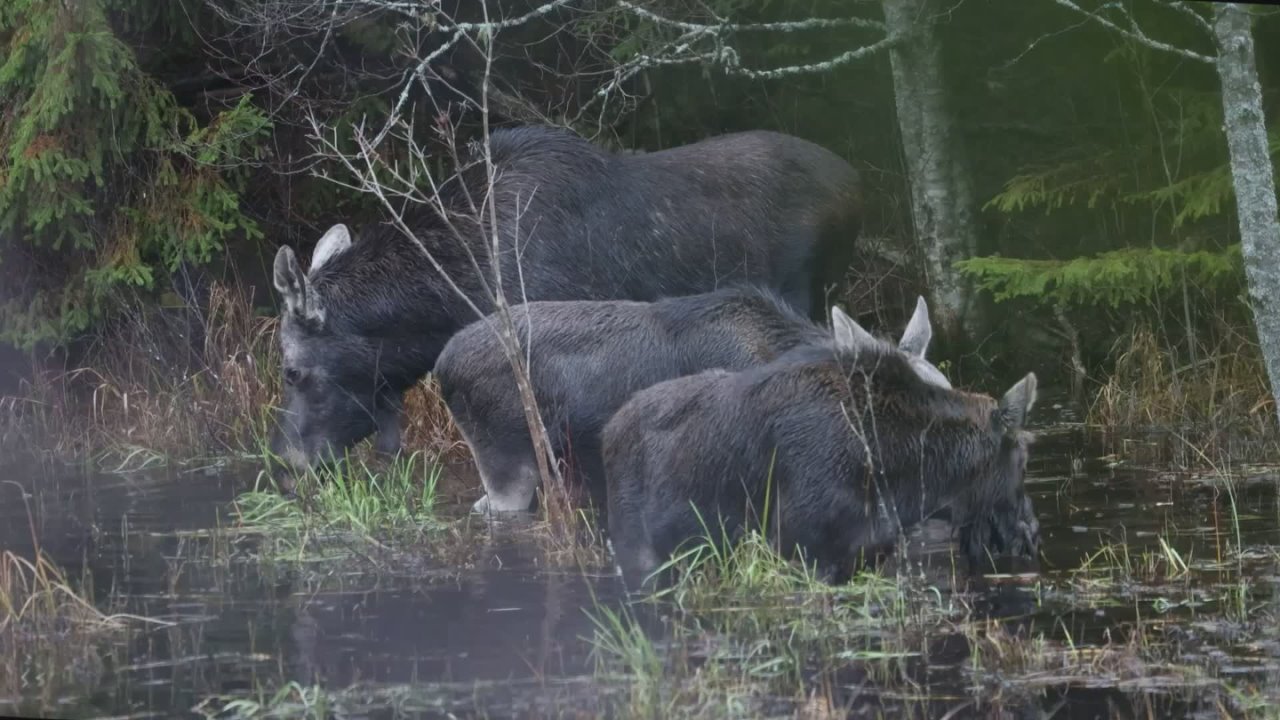 В Ленобласти неспешная лосиная семья приступила к водной трапезе