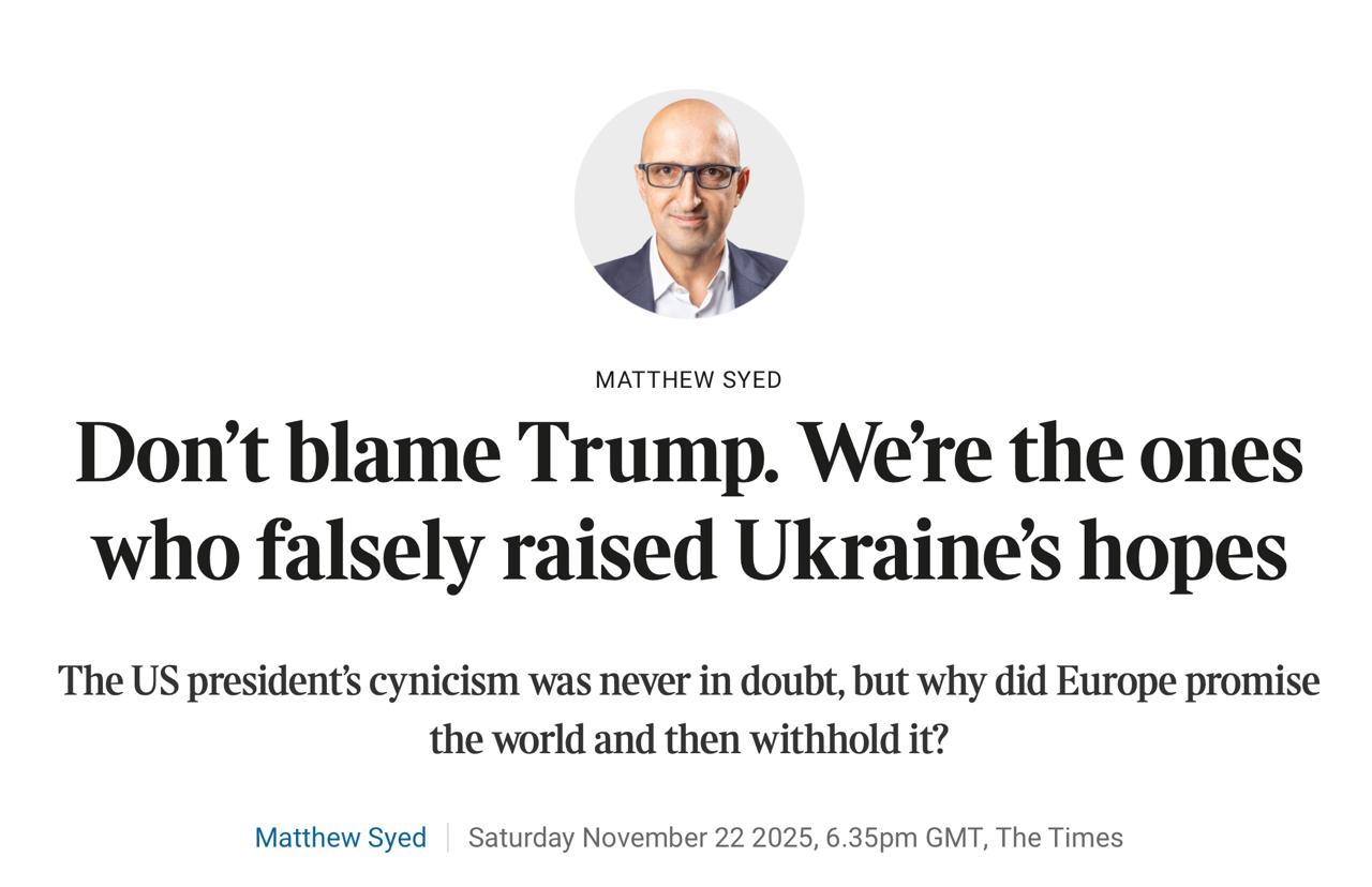 Бывшая первая ракетка Англии по пинг-понгу Мэттью Сайд, в последнее время вообразивший, что разбирается в мировой политике, сегодня разродился колонкой на страницах The Sunday Times. Заголовок: «Не вините Трампа. Это мы породили ложные надежды Украины».