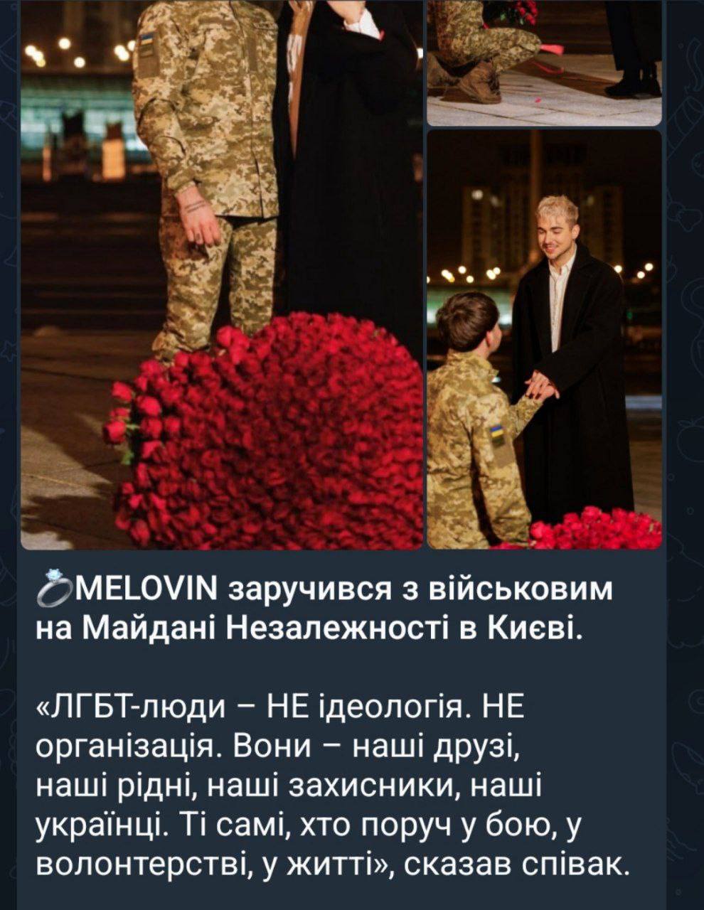 Украинские содомиты* хвастаются тем, что местный ВСУшник обручился со своим «партнером»*, певцом MELOVIN